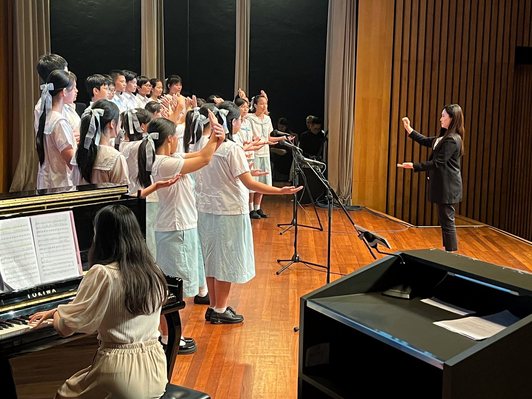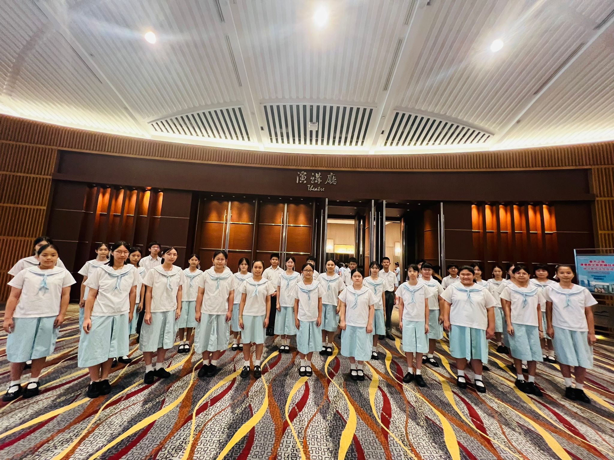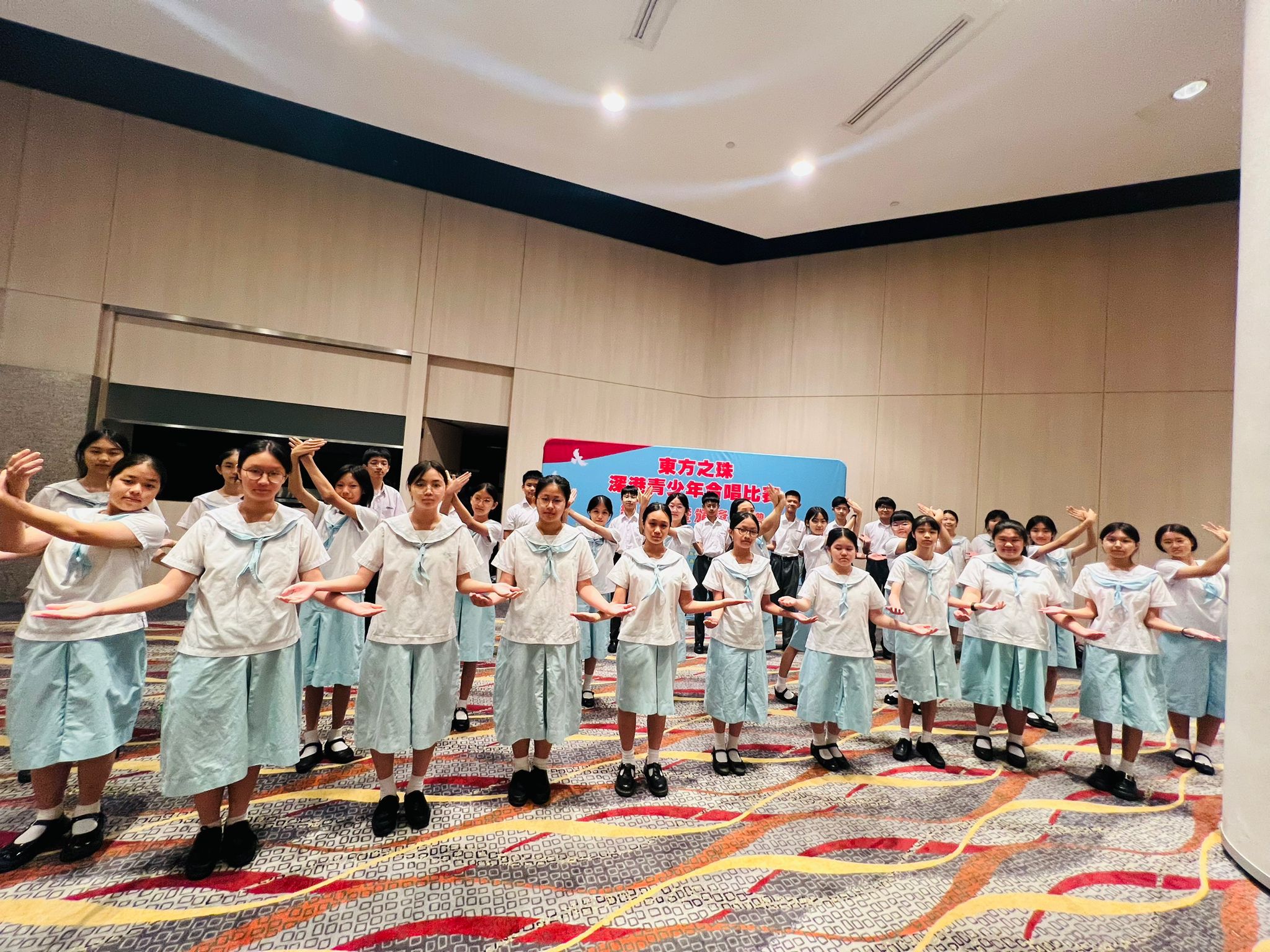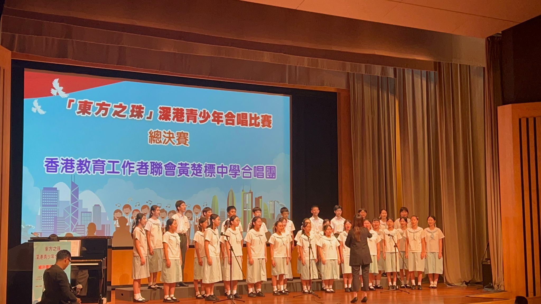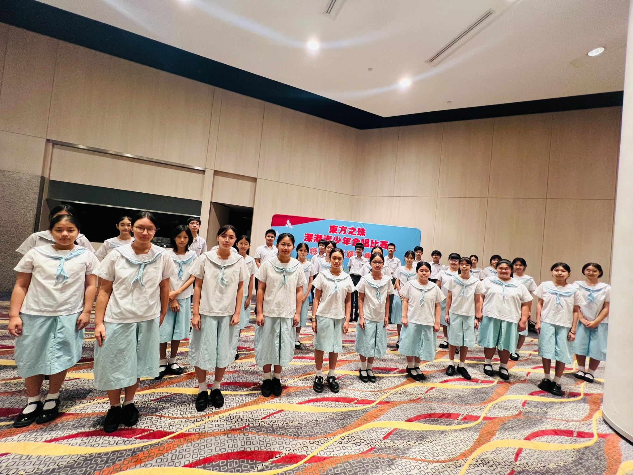 我校合唱團今天有幸入圍參與「東方之珠」深港青少年合唱比賽總決賽,活動由藝術香港機構舉辦,以慶祝中華人民共和國成立75 周年暨香港回歸祖國27 周年的大日子。活動在香港灣仔會議展覽中心演講廳舉行,比賽完結後,大會安排了中國歌曲《春天的故事》和《濤聲依舊》的填詞人蔣開儒兒生和陳小奇先生與學生分享,提升了同學對祖國作品的認識及評賞能力。我校合唱隊於這次比賽中榮獲二等獎,實屬可喜可賀。
