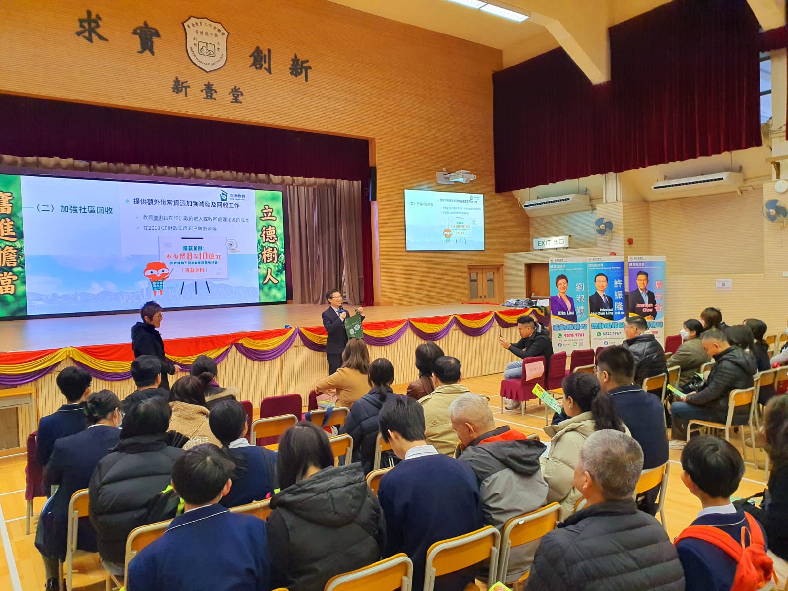 許校長為全天活動打響頭炮,簡潔有力地介紹我校如何透過方方面面的安排,幫助學生達成七個學習宗旨。接著,我們進行了家長校董選舉,經過嚴謹公正的投票、點票程序,最後由陳雲先生當選。之後,班主任在課室與家長、學生面談,商討上學期的學習表現,查找不足,力求進步。同時,校園內各處也準備了各式各樣的展覽和活動,讓子女帶著家長,體驗校園生活。許校長更聯同周元谷議員、劉淑嫻議員,就都市固體廢物收費進行簡介,希望讓家長對有關安排有更清晰的了解。這一切一切,都是為了促進家校合作,共同努力,協助學生成長、成功、成才。
